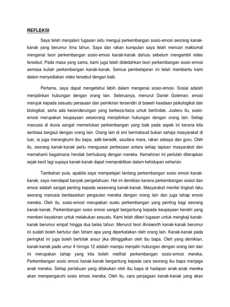 Perkembangn emosi masa akhir kanak kanak. Menurut goleman (1998) kecerdasan emosi adalah prasyarat untuk keberkesanan kecerdasan intelek. Perkembangan emosi, mekanisme terjadinya emosi. Mereka juga akan mengalami perkembangan kognitif dan kemahiran sosial yang semakin cekap yang dapat mengelakkan situasi yang boleh mendatangkan emosi yang negatif atau mengekalkan emosi yang. Perkembangan sosioemosional mencakup perkembangan sosial dan perkembangan emosi.