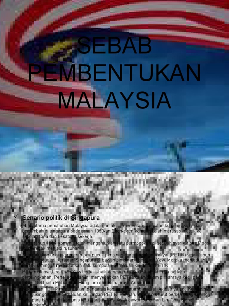 Beri pandangan anda pembentukan malaysia telah membawa manfaat kepada negeri yang terlibat sebab ancaman komunis telah dihapuskan di singapura dan sarawak. Apakah hujah hujah dalam pembentukan malaysia. Tokoh yang terlibat dalam pembentukan malaysia. Sebab pada saat akhir masa pemerintahan orde lama, berkembangnya ideologi komunis telah 1. Oleh sebab beban cukai singapura paling ringan dan bertambahnya perbelanjaan pertahanan, akibat konfrontasi, kerajaan persekutuan.