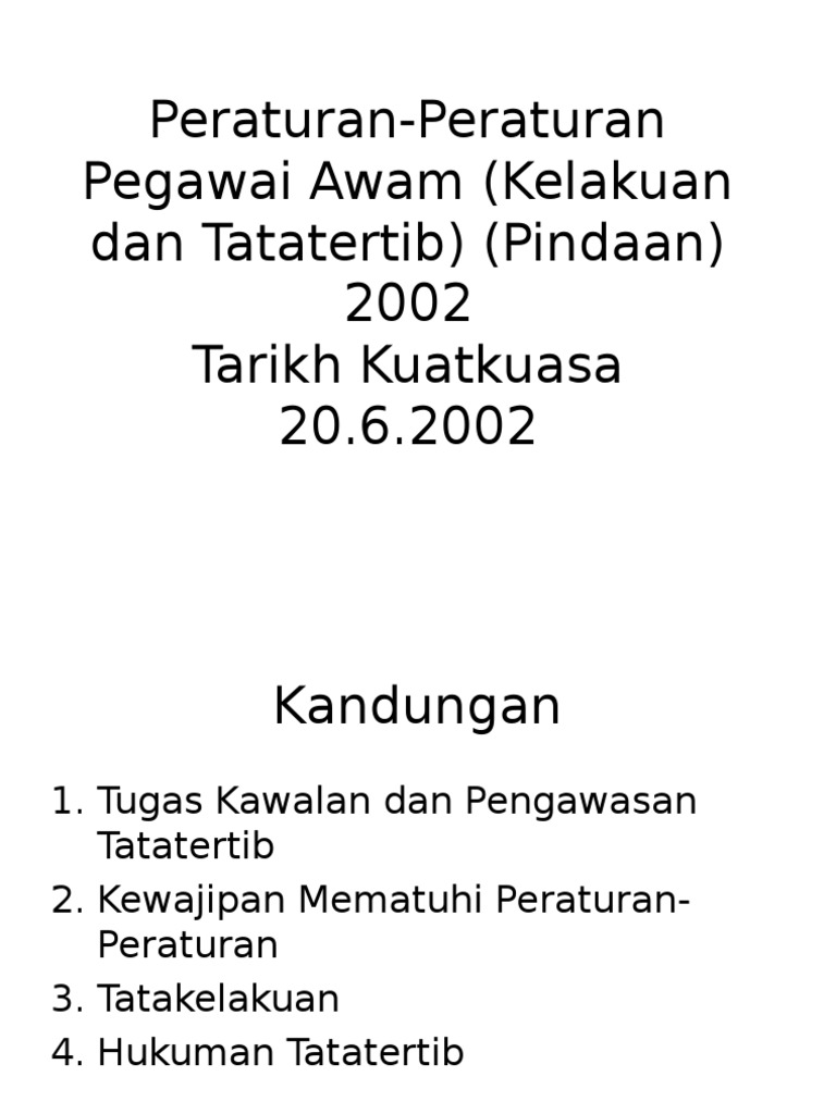Peraturan Peraturan Pegawai Awam Kelakuan Dan Tatatertib from imgv2-2-f.scribdassets.com Check spelling or type a new query. We did not find results for: Maybe you would like to learn more about one of these?